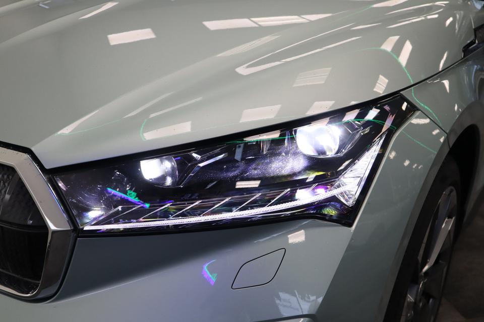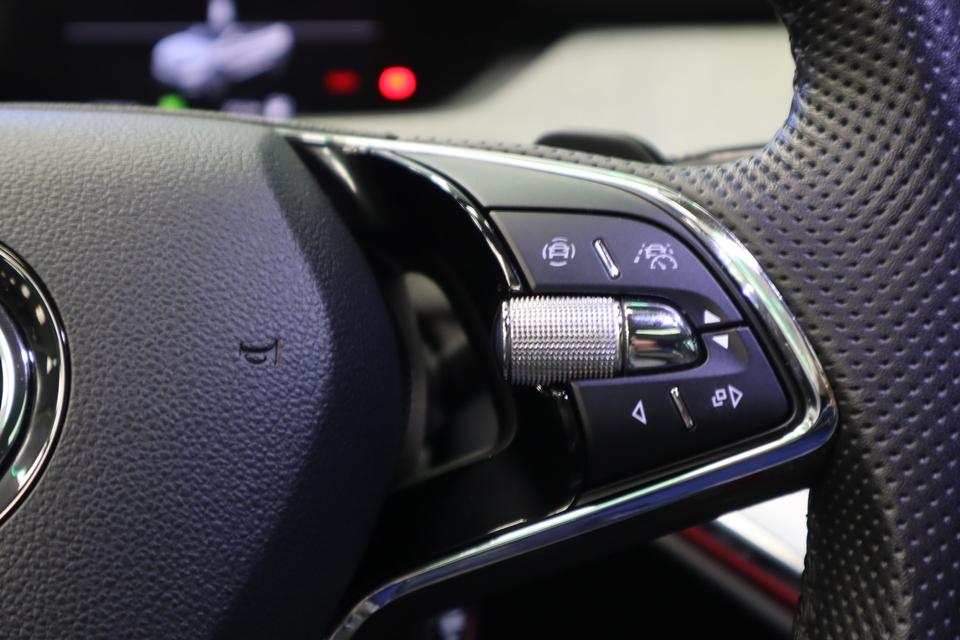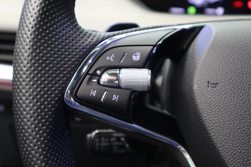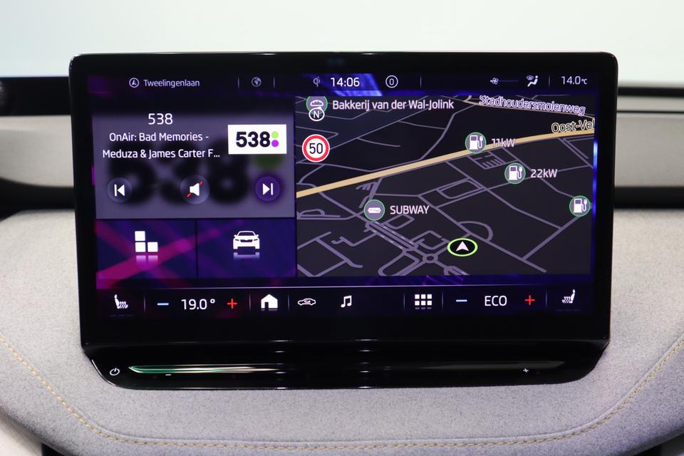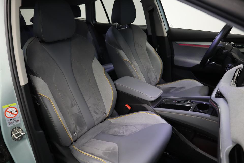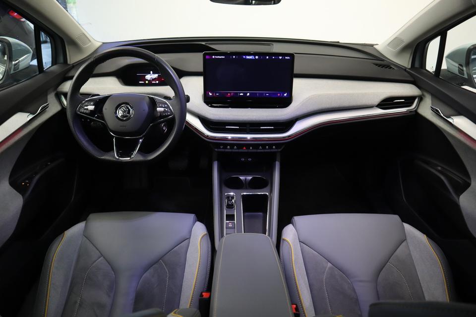 In deze Enyaq iV vindt u niet alleen schakelaars op het stuur om het full map navigatiesysteem te bedienen en het audio-installatiesysteem met DAB-ontvangst, maar er is ook spraakbediening. Onderweg uw smartphone opladen zonder gedoe met stekkers en kabels? Dat kan, met de draadloze oplaadmogelijkheid voor telefoons. Of het buiten nu warm is of koud, dankzij electronic climate control is het binnen altijd behaaglijk. Niets ontgaat het systeem van deze auto. De regensensor zorgt dat de ruitenwissers bij neerslag vanzelf aan gaan en de automatisch inschakelbare verlichting regelt de verlichting. Veilig afstand houden gaat automatisch met de adaptive cruise control en de parkeersensoren achter maken parkeren supersimpel. Sleutelloos instappen en wegrijden! De keyless start herkent de elektronische sleutel in uw bezit en start de motor met een druk op de knop.